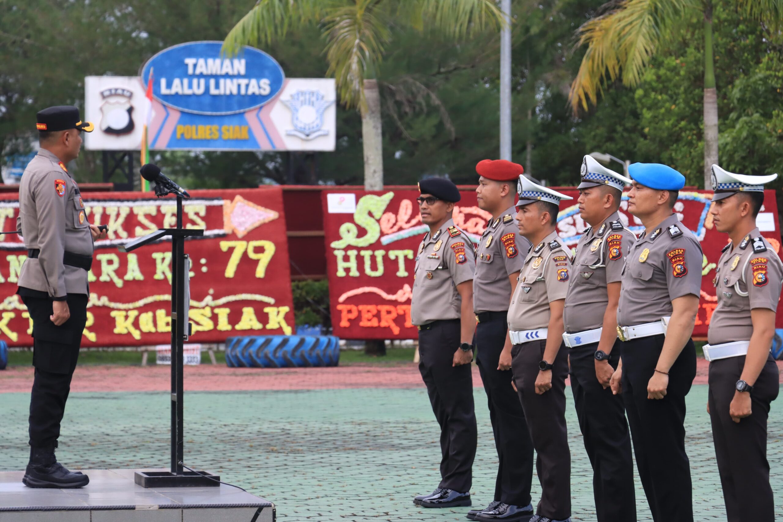 Kapolres Siak, AKBP Eka Ariandi Putra, S.H., S.I.K., M.Si, memimpin langsung upacara yang dimulai pukul 17.30 WIB. Ia didampingi AKP Sohermansyah, S.H. sebagai Perwira Upacara dan Rijal Karo Karo, S.H. sebagai Komandan Upacara. Seluruh jajaran Polres Siak berdiri dalam barisan, membawa semangat dan rasa syukur atas capaian rekan-rekan mereka.