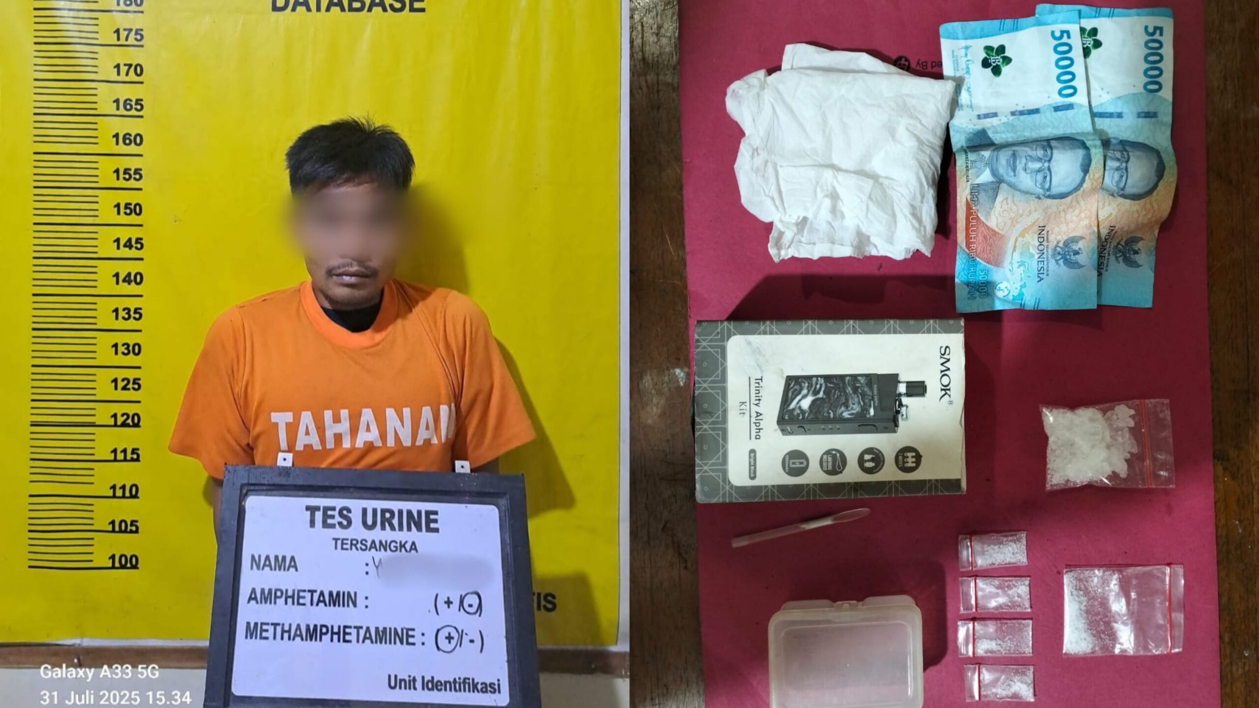 Barang bukti lain yang turut diamankan antara lain 1 unit HP OPPO A60 warna biru langit, 2 lembar uang tunai pecahan Rp50.000, 1 pipet berbentuk sendok, diduga sebagai alat konsumsi.