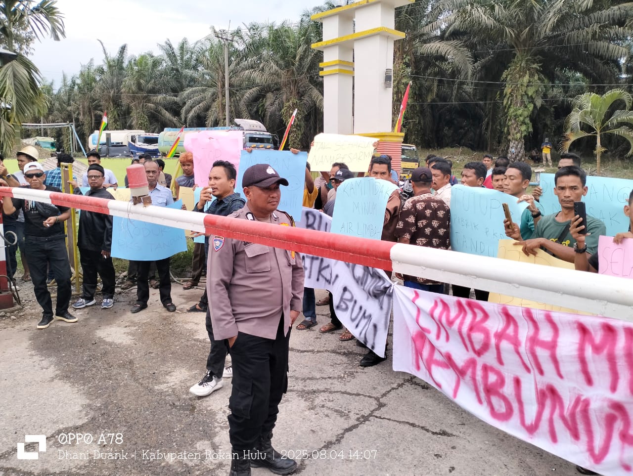 KAMPAR, PUBLIKNEWS.COM – Masyarakat Desa Kasikan, Kecamatan Tapung Hulu, Kampar, Riau melakukan aksi unjuk rasa di depan pabrik pengolahan kelapa sawit (PKS) milik perusahaan perkebunan PTPN lV regional lll Tandun, pada Senin (4/8/2025) siang.
