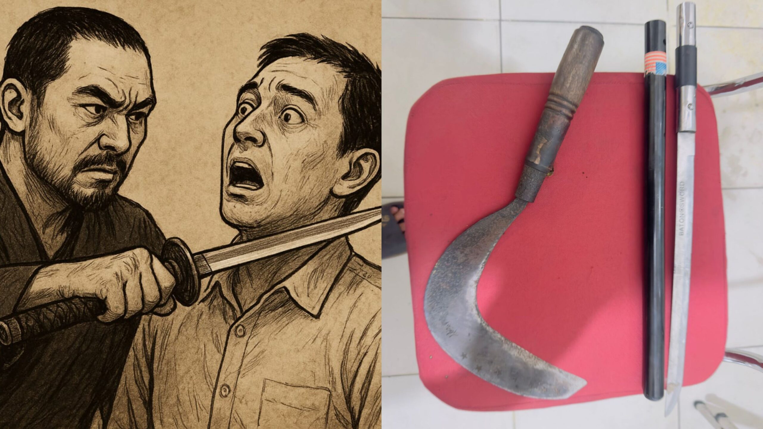 Polisi kini mengamankan barang bukti berupa sebilah samurai, arit, dan tas selempang cokelat. Penyidik masih mendalami keterkaitan antara laporan penganiayaan dengan percobaan perampokan tersebut.