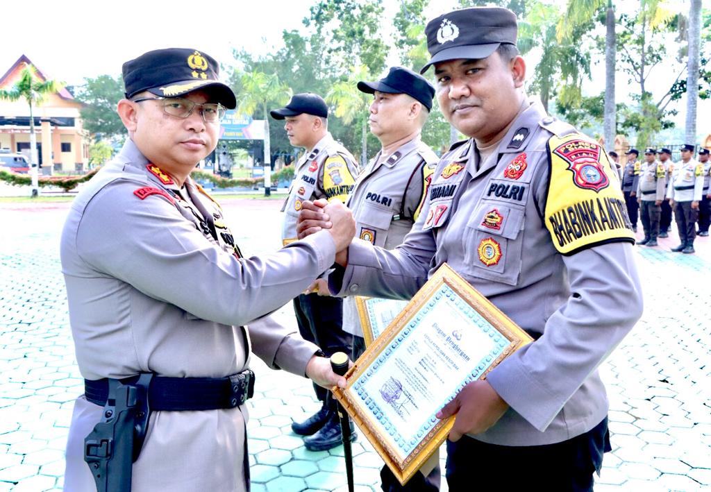 Setelah Apel akbar digelar, Kapolres Siak AKBP Asep Sujarwadi secara langsung memberikan penghargaan kepada 5 Bhabinkamtibmas yang dinilai melakukan tugas dengan baik dalam melaksanakan pelaporan.