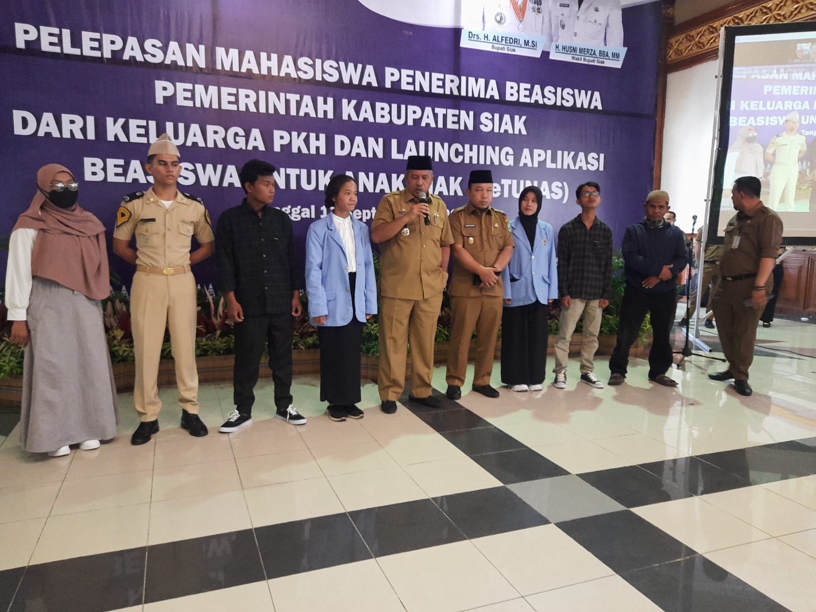SIAK, PUBLIKNEWS.COM – Bupati Siak Alfedri melepas mahasiswa penerima beasiswa Kabupaten Siak dari Program Keluarga Harapan (PKH) di Ruang Rapat Raja Indra Pahlawan, Kantor Bupati Siak, Senin (12/9/2022) pagi.