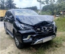 Akibat kecelakaan tersebut mobil jenis Fortuner yang berplat hitam tersebut mengalami kerusakan parah di bagian depan.