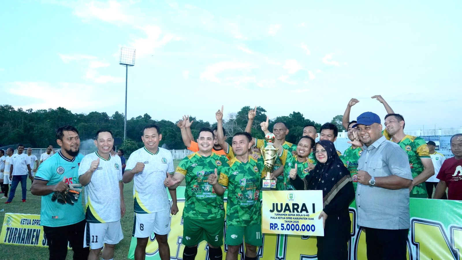 Turut hadir dalam acara tersebut Ketua DPRD Siak Indra Gunawan, SE, serta pasangan Bupati dan Wakil Bupati Siak terpilih periode 2025–2030, Afni Zulkifli dan Syamsurizal. Kehadiran para tokoh daerah ini semakin menambah semarak dan kebanggaan masyarakat yang memadati stadion.