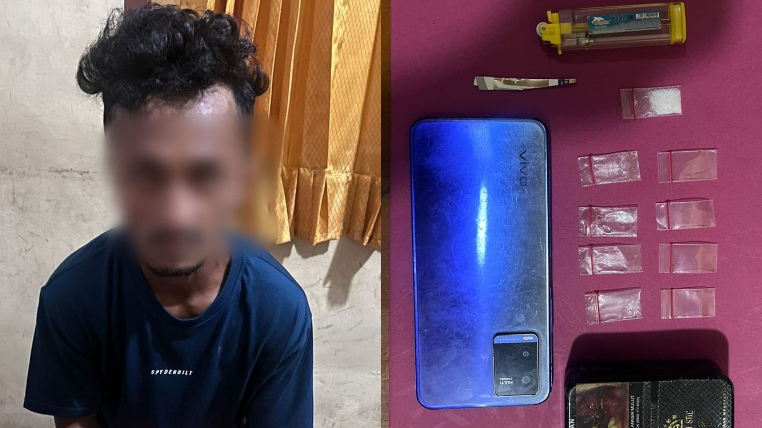 Dari penggeledahan, polisi menemukan satu paket shabu seberat 0,23 gram yang dibungkus plastik bening di dalam kaleng rokok Dji Sam Soe. Selain itu, diamankan pula delapan plastik klip kosong, satu unit handphone Vivo, dan sebuah mancis.