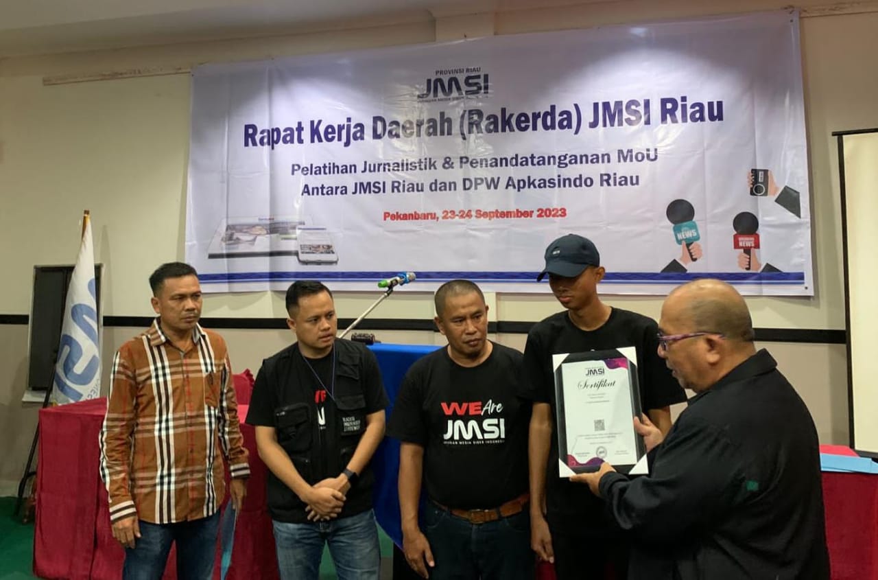 PEKANBARU, PUBLIKNEWS.COM – Puluhan perusahaan pers yang tercatat sebagai anggota Jaringan Media Siber (JMSI) di Provinsi Riau, secara simbolis menerima sertifikat QR Barcode Scanner JMSI Sabtu (23/9/2023) dalam Rapat kerja daerah (Rakerda JMSI Riau).