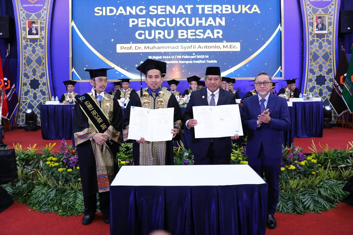 MoU tersebut ditandatangani langsung oleh Bupati Siak Alfedri dan Rektor Institut Tazkia Dr. Ardhariksa Zukhruf Kurniulloh, M.Med.Kom disaksikan oleh Menteri Perdagangan RI Dr. (Hc) H Zulkifli Hasan, S.E, M.M dan Guru Besar Institut Tazkia Prof Dr. Muhammad Syafii Antonio, M.Ec.