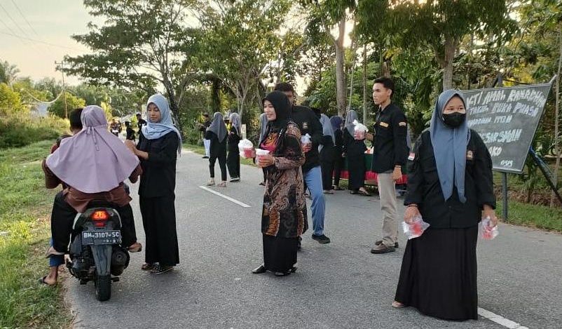 Dengan berpakaian seragam lengkap, siswa SMAN I Pusako yang tergabung dalam OSIS menghampiri pengguna jalan dan memberikan bingkisan takjil. Hal itu dilakukan, mengingat beredarnya surat larangan menjalankan buka bersama yang mengumpulkan banyak orang.